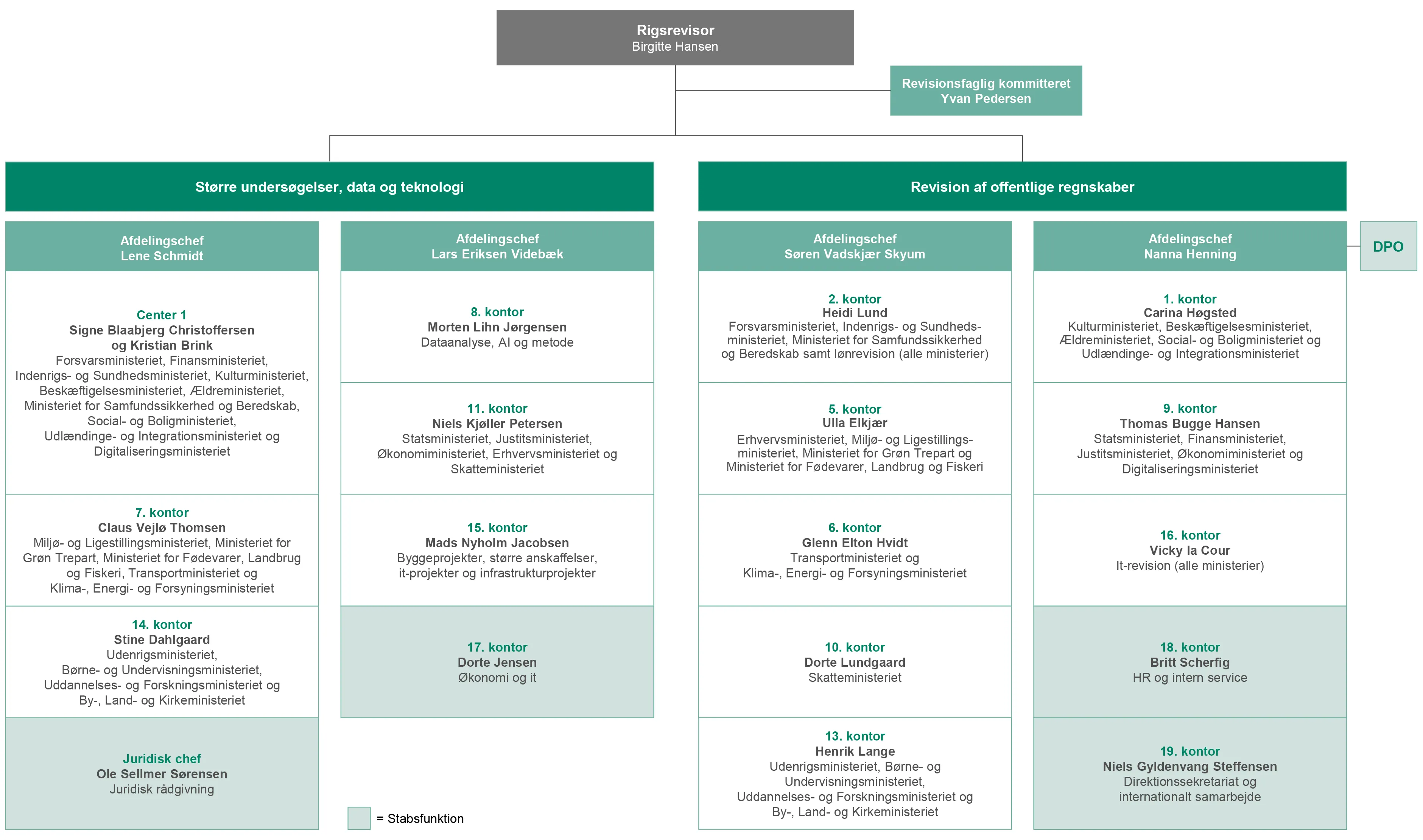 Rigsrevisionens kontorer er fordelt på 2 afdelinger, der hver har fokus på vores 2 kerneopgaver. Rigsrevisionen ledes af rigsrevisor Birgitte Hansen i samarbejde med 4 afdelingschefer.